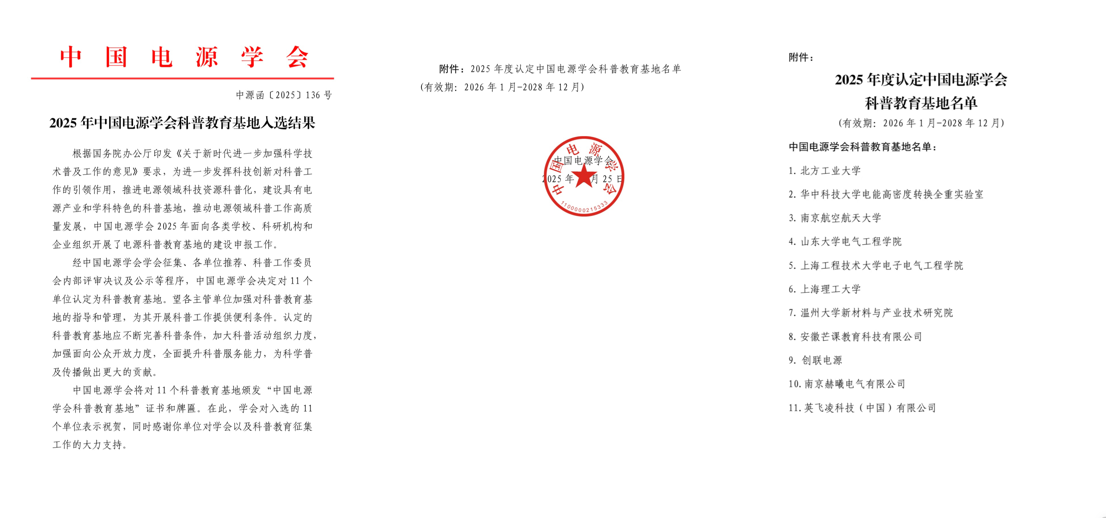 近日,中国电源学会公布2025年度科普教育基地名单,公司凭借在能源科普领域的扎实工作和显著成效成功入选。