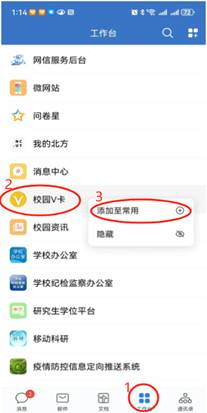 在企业微信中,点击“工作台”,找到”校园V卡”小程序,如经常使用,可长按“校园V卡”小程序,添加至常用,如下图所示。校园V卡可在食堂及超市刷码消费,进入校园V卡后可看到“虚拟卡余额”,即校园卡余额,在余额充足情况下,点击“扫码消费”,将二维码对准放在卡机扫码处,听到“滴”的一声扫码成功。