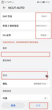 (1)连接NCUT-AUTO苹果系统输入账号和密码,点击“加入”或“join”按钮即可。安卓系统连接NCUT-AUTO时EAP方法选择“PEAP”,阶段2身份验证选择“MSCHAPv2”,CA证书选择“不验证”,然后身份字段输入账号、匿名身份置空、输入密码,点击连接即可。
