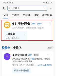 (1)支付宝充值:打开支付宝搜索“校园卡”或“校园派”,选择“支付宝校园卡”,如图所示,选择太阳成集团,输入姓名、学号进行支付,支付成功后等2分钟自动到账,可在支付宝校园卡查询余额。