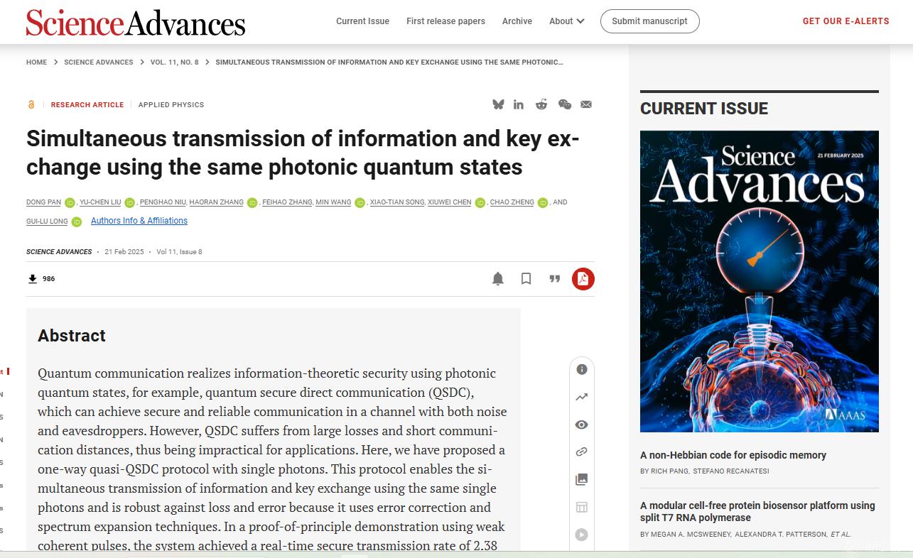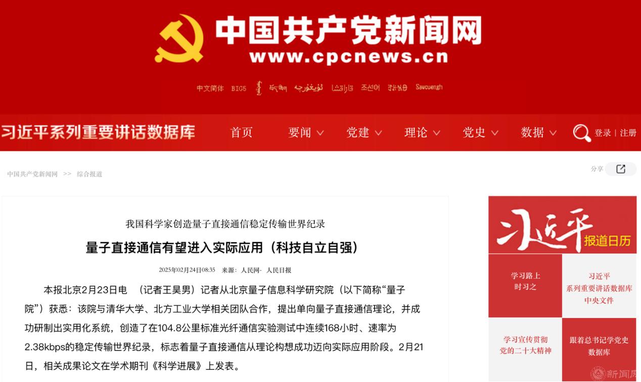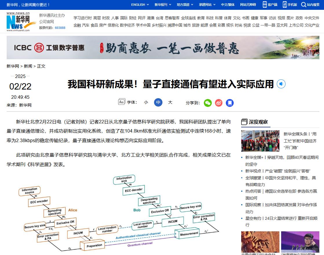 近日,储能量子直接通信与计算团队作为参研单位,与北京量子信息科学研究院和清华大学相关团队合作,提出单向量子直接通信理论,成功研制出实用化系统,创造了在104.8公里标准光纤通信实验测试中连续168小时、速率为2.38kbps的稳定传输世界纪录。相关成果于2025年2月21日在国际知名学术期刊《Science Advances》(《科学进展》)上发表,这标志着量子直接通信从理论构想成功迈向实际应用阶段。